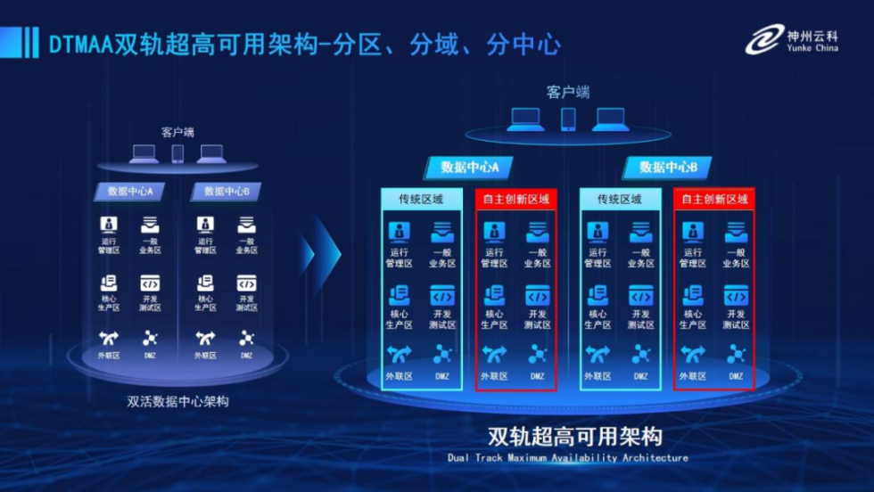 为帮助金融客户更好地应对数字经济时代对可持续性的高要求,实现“信创”与“数字化”齐头并进,米兰电竞推出了双轨超高可用架构。该架构在双活数据中心的分区调度基础上,增加信创域和非信创域的分域调度,实行信创域与传统域应用全量部署,使双中心运营变为双中心四区域并行运行,互为多活,将“0到1”的单轨建设道路变为分区分域协同的多活双轨超高可用架构。帮助客户在新架构下,保障“信创”的同时解决性能瓶颈,提升稳定性,保证应用可持续性,最终实现信创区域和非信创区域的平滑过渡,完成国产化替代目标。